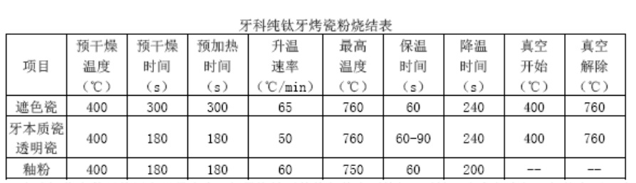 OP按燒結參數燒結,溫度可以略高但不可偏低,烤瓷燒結冷卻的時(shí)候注意設置一下冷卻溫度,否則正常的開(kāi)蓋速度會(huì )讓純鈦烤瓷因為瓷的溫度迅速降溫,而純鈦支架熱傳導比較慢導致蓄熱而產(chǎn)生裂瓷。同時(shí)因為純鈦的熱傳導低的原因,預熱溫度一般也會(huì )設置得比較低。純鈦是低熱傳導物質(zhì),所以純鈦的烤瓷程序的升溫速率一般都會(huì )設置得較低以獲得金瓷溫度的同步。