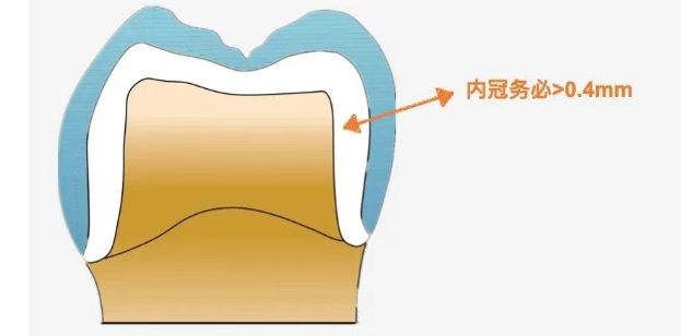 (若使用打印金屬,打印金屬放置支撐區域,內冠厚度設計不低于0.6mm,因為打印后該區域需要磨除一層來(lái)保證金屬表面的致密度,避免后期飾瓷后出氣泡。)